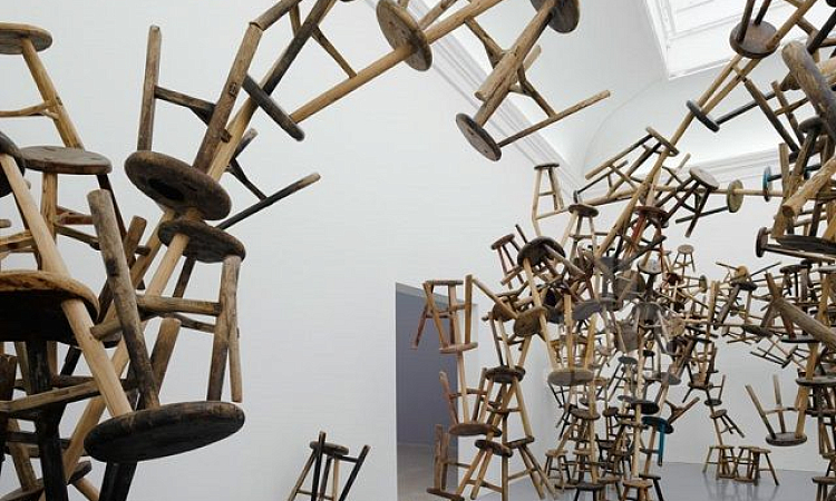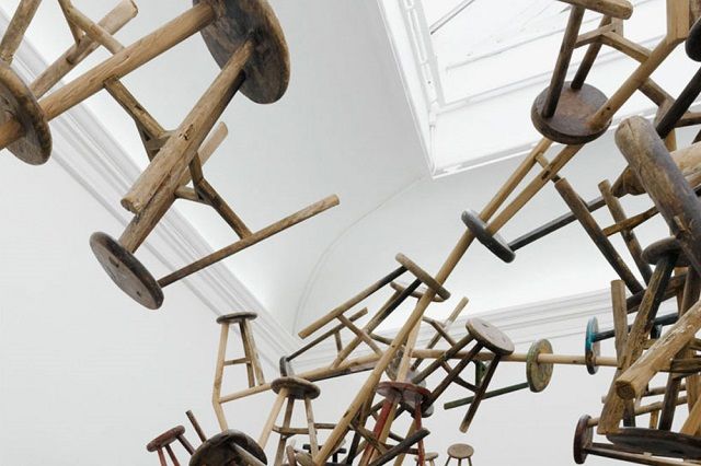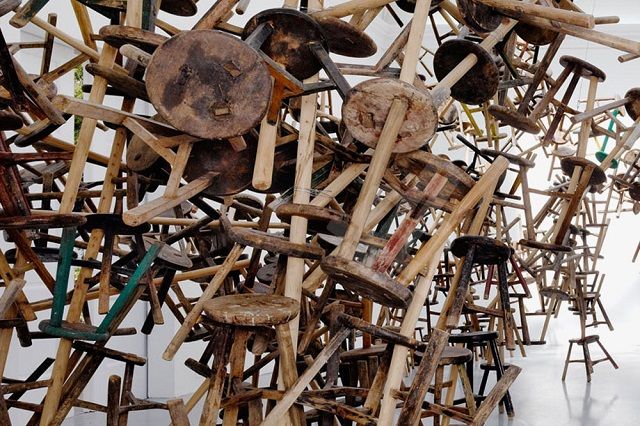 Накануне открытия своей инсталляции в немецком павильоне известный китайский художник-диссидент Ай Вэйвэй напомнил о себе миру искусства. 887 деревянных стульев на трех ножках дожили до наших дней со времен правления династии Цин — последней из императорских династий, правивших Китаем. Ай Вэйевэй собрал табуретки в одну гигантскую скульптуру, так укрепив их между собой, что они как будто парят в воздухе.