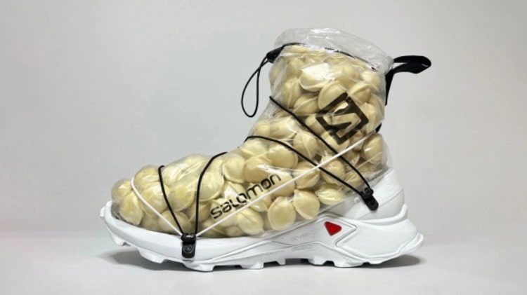 Оригинальная пара обуви стала своеобразной интерпретацией кроссовок Salomon. Верх ботинок изготовлен из пакета, в который помещены пельмени. Крепится он к подошве при помощи резинок.