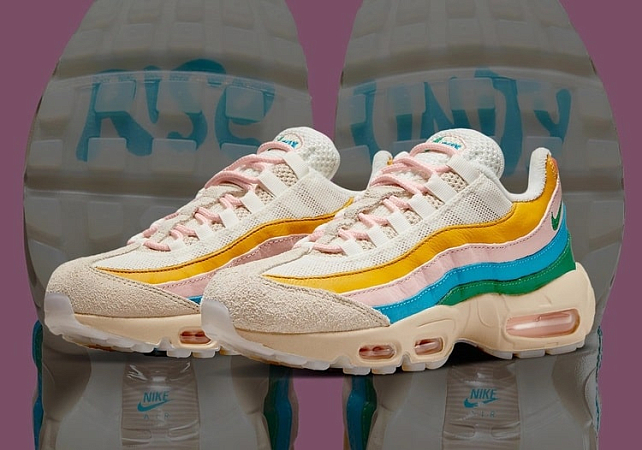 Air Max 95 «Rise Unity» - яркая новинка компании Nike, которая притягивает взгляды. Кроссовки выполнены в пастельном оттенке с добавлением ярких полос по всему контуру и розовых шнурков. Сочетание зеленого, оранжевого, нежно-розового и зеленого придает обуви оригинального яркого вида. Такая комбинация оттенков – это напоминание о проблеме неравенства в мире. Таким образом, компания озвучила свою позицию в данной проблеме: несмотря на различия, все люди равные.